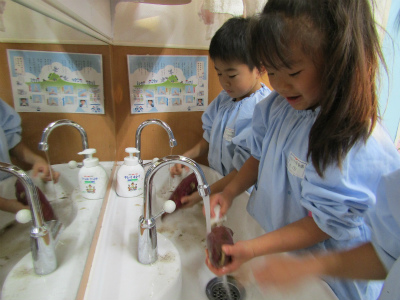 先日の芋ほりで収穫したさつまいもをほし組、そら組と一緒に洗いました。