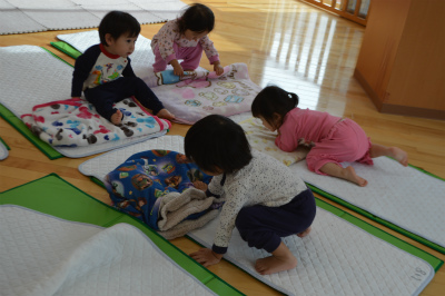 いちご組のお友達は少しずつ自分で出来ることが増えてきています。 午睡の時間になり、みんなで「おやすみなさい」の挨拶をした後、 自分の布団を探して、「ゴローン。」と言いながら寝転がります。 自分の物を理解できるようになりま…