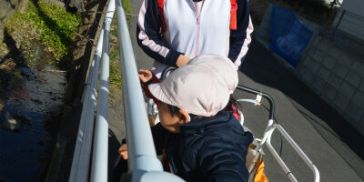 田んぼの近くに水が通っていて、もも組さんは何か見つけ「あっ!」と先生に教えていました。