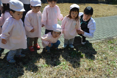 てんとう虫に、あり。「あったかくなってきたから外に出てきたんだね。」と保育者が話すと、「こんにちは!」と挨拶をしていました。