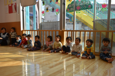 保育者が玩具を出すとみんな柵に沿って座っていました(^.^)♡