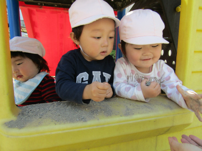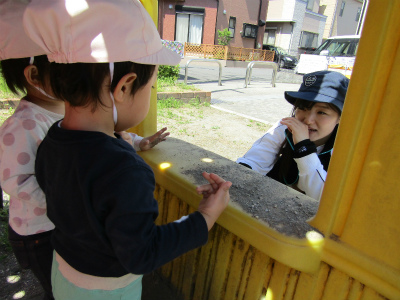 お店屋さんみたいに遊んでいました。「どうぞ~」と言う声は公園いっぱいに広がり、とても楽しそうにしていました。