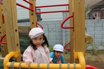 園庭ではたいよう組さんもいて、一緒に楽しく遊び、遊具など登れないところがあるとお兄さんたちが手伝ってくれていました。