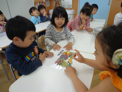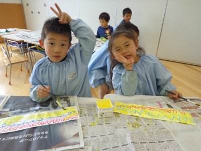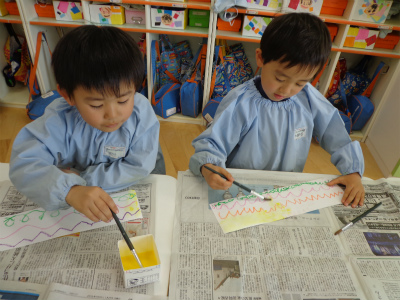 クレヨンで描いたところだけが、絵具をはじき子供たちはきれいにできたことを喜んでいました。