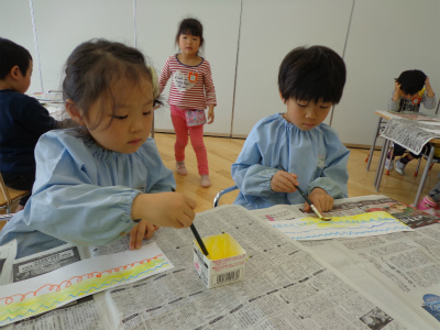 その上から、自分たちで筆を使い絵具を塗りました。