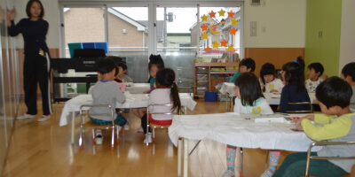 クレヨンを使い、線の上をなぞる「なぞり書き」と言うものを行いました。