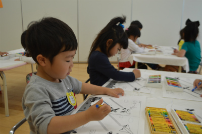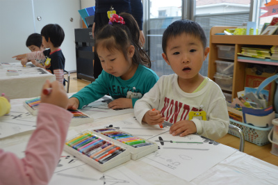 クレヨンの持ち方もしっかりとし、線からはみ出さないように集中して