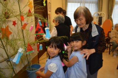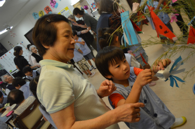 笹に飾るときは、高いところもおじいちゃんおばあちゃんが手伝ってくれました。