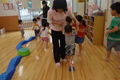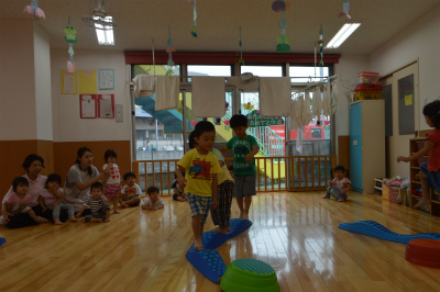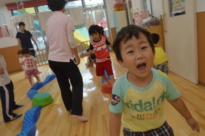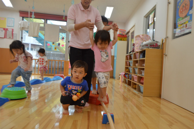 サーキットです。平均台を並べました。平均台は真剣そうに渡り、保育部さんも頑張っていました。