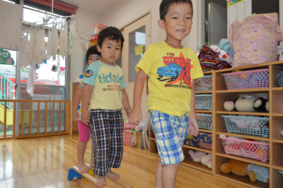 幼稚部さんはだんだん慣れてきたので運動棒も取り入れて一本橋を作りました。