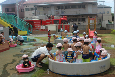 今日は消防車が保育園に来ていて、お友達は「かっこいいね」と大興奮でした。