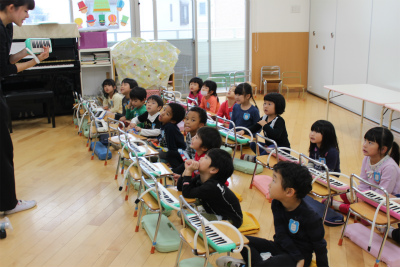 鍵盤ハーモニカ練習をしていました。5本の指で弾く練習をして