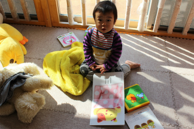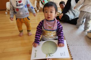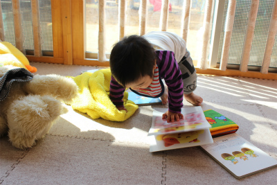 今日はもも組さんを覗いてみました。お部屋では、絵本を広げて指を差しながら