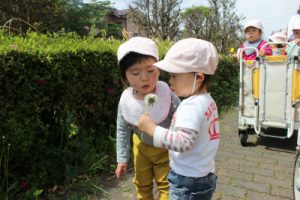 4月162018にじいろブログ今日は、いちご組さんのお散歩をのぞいてみます!! すっかり春の気候になりお外には、たくさんのお花や 虫さんに出会えます。 たんぽぽや綿毛を見つけてとっても嬉しそうです★ 他にもトッラクに手を振ったりかわいい猫さんを じーっと観察してとても楽しいお散歩になりました! またたくさんの春を探しに行こうね♪ Post navigationPreviousPrevious post:4月2日(火)NextNext post:4月17日(火)