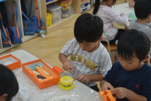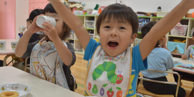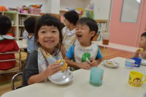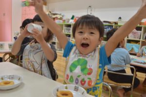 10月182018にじいろブログめろん組はおやつの時間です。 今日のおやつはドーナツでした。 甘いドーナツに牛乳はよく合います。 とっても幸せそうでした。 そら組は、画用紙で「ジャック・オー・ランタン」を作りました。 ハロウィンにぴったりな天井飾りで 保育室の雰囲気も変わります。 魔除けの効果もあるといわれています。 Post navigationPreviousPrevious post:10月17日(水)NextNext post:10月22日