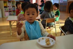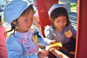 11月302018にじいろブログもも組のおやつの様子です。 今日のおやつは「おかかおにぎり」でした。 みんなで仲良くいただきました。 ほし組とそら組は、しのは公園にいきました。 この季節は公園の遊具で遊ぶよりも、地面に積もっている 落ち葉で遊ぶ方が楽しいみたいです。 お気に入りの落ち葉を友達と見せ合うのが女子のトレンドです。 Post navigationPreviousPrevious post:11月29日(木)NextNext post:12月3日(月)