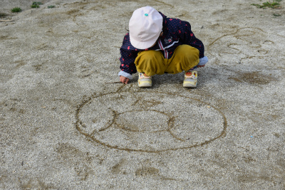 公園の地面の上に先生が上手にアンパンマンの絵を描くと、