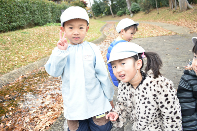 12月112018にじいろブログもも組の散歩の様子です。 今日は、青柳25公園で遊びました。 風がとても冷たく、コートを来て出かけました。 ほし組の散歩様子です。 今日は貯留池で落ち葉を拾って遊びました。 大きな落ち葉や小さな落ち葉がたくさんあり、 お気に入りの一枚を探して楽しみました。 屋外の寒さに負けず元気に遊びました。 Post navigationPreviousPrevious post:12月10日(月)NextNext post:12月12日(水)