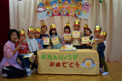 12月182018にじいろブログ今日は12月生まれのお友達の誕生日会です。 たくさんのお友達にお祝いをしてもらえて、とても嬉しそうでした。 大きなケーキと記念に一枚撮りました。 幼稚部は発表会のリハーサルをしました。 みんな緊張感を持って練習しました。 元気いっぱい、大きな声を出せていました。 これからも練習を進めていきます。 自信を持って舞台に立てるまでもう少しお待ち下さい。 Post navigationPreviousPrevious post:12月14日(金)NextNext post:12月19日(水)