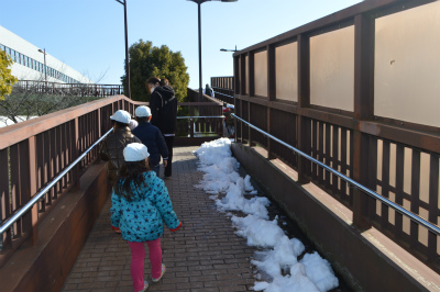 今日は全クラス合同で園の周りを散歩しました。 歩道や道路には、まだまだ雪が残っていて子ども達も喜びながら歩いていました 歩道橋を渡りましたが、歩道橋の下にある川がきれいに凍っていて驚きました! 年長の子からは「水の流れが…