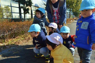 いちご組さんは元気にお散歩に出かけていきました♪ 今日は、なにが見つかるかな? コミュニティセンターに着くとさっそくかけっこです! 元気に走り体はポカポカ。 「あれ何ー?」 お空を見上げて何かを見つけたようです。 上を見…
