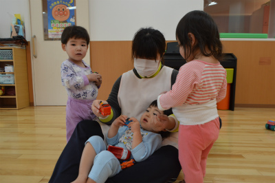 土曜保育の保育部の様子です。 お昼寝前のおもちゃ遊びでは、みんなお気に入りのおもちゃを持って、 遊びます。 保育者の膝の上に座り、一緒に遊んでいますね。 トラックはどこかな~?と歩いて探してい…