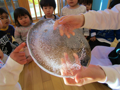 寒い寒い朝でした。 お外に置いておいたバケツの中には、 見事な氷ができていました♪ ピカピカ、つるつるの氷に いちご組さんも興味津々。 最初は、恐る恐るでしたが慣れてくると 「冷たいね」「ピカピカ!」 と、おしゃべりをし…