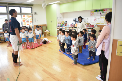 今日は、体操教室の日です。 普段とは、少しだけ変わったことがありました。 それは…めろん組が来年に向けて見学にやってきたことです! ほし組のお兄さんお姉さんもめろん組に いいところを見せようと張り切って運動を…
