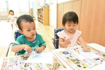 めろん組の室内遊びの様子です。 食べ物のおもちゃを使ってお料理ごっこや お買い物ごっこをしてお友達と仲良く遊びました。 そら組の制作の様子です。 おりひめとひこぼしの着物を自分達でデザインしました。 きれいな着物になるよ…