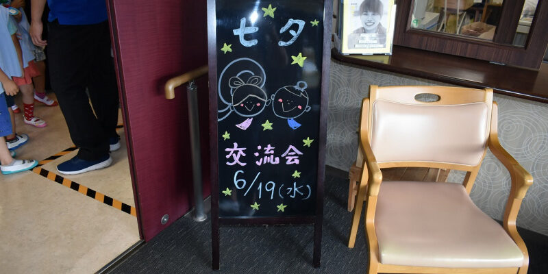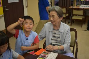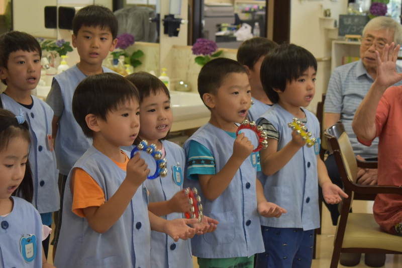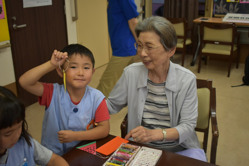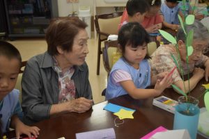 6月192019にじいろブログ今日は、フェリス八幡さんと七夕交流会でした。 草加にじいろ保育園は、4歳児、5歳児が参加しました。 一緒に七夕の笹飾り(流れ星とスイカ)を作って手作りの笹に飾りつけをしました。 おじいちゃん、おばあちゃんに歌のプレゼントをすると泣いて喜んでくれました。 帰りには、手作りのお花のプレゼントをもらって帰りました。 素敵なプレゼントをどうもありがとうございました(*^_^*) Post navigationPreviousPrevious post:6月16日(日)NextNext post:6月19日(水)