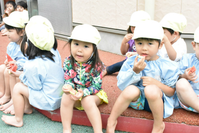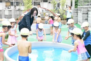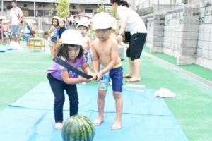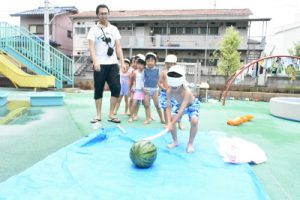 7月82019にじいろブログ今日は「プール開き」でした。 今年も安全にプール遊びができるように園児を代表してたいよう組が 清めの塩を園長先生とまきました。 そしてみんなでスイカ割りをして夏の訪れを感じました。 美味しいスイカを口いっぱいに頬張っていて、 お友達と「甘くて美味しいね」と話していました。 今年も楽しくプールで遊ぼうね! Post navigationPreviousPrevious post:令和元年度 おじいちゃんおばあちゃん交流会NextNext post:7月9日(火)