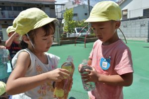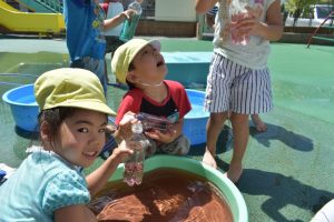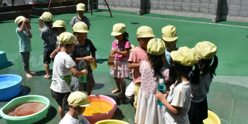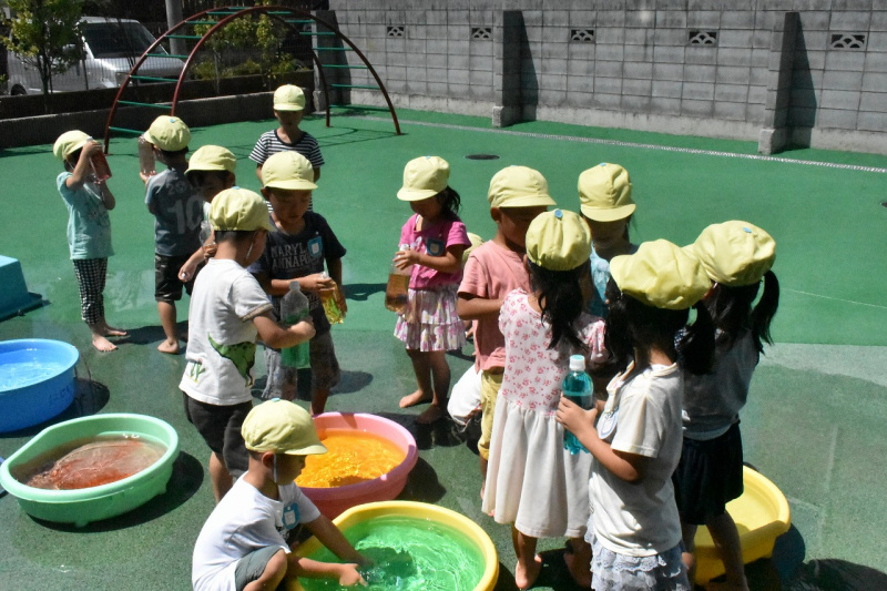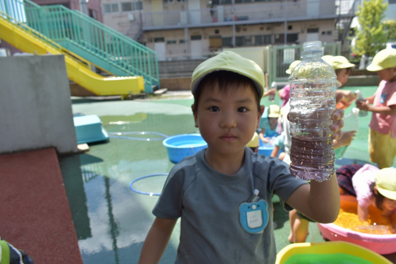 お友達と見せ合ったり、たくさんのカラー水で色鮮やかに遊びました!!