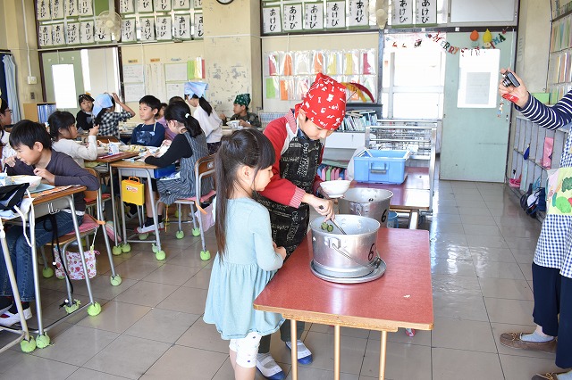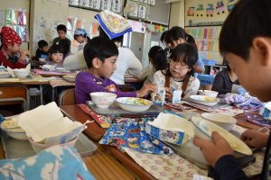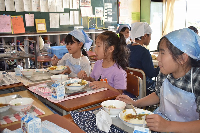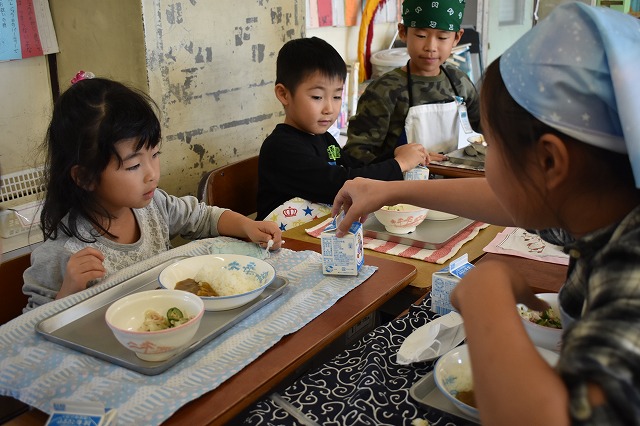 本日のたいよう組の給食体験の様子です。 八幡小学校5年生のお兄さん、お姉さんに仲間入りしてカレーライスを食べました☆ とても優しくて、たくさん面倒をみてくれました☆ パックの牛乳に興味津々!! 来年小学生になるのが楽しみですね☆ Post navigationPreviousPrevious post:11月12日(火)NextNext post:11月13日(水)