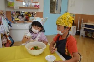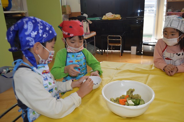 そら組とたいよう組はさつま芋のサラダを作りました。 栄養士の先生のお話をよく聞いて、楽しみながら調理しました。 自分達で作ったサラダ、とっても待ちどうしかったようで「味見していい?」 と何度も聞いていました。 給食では、みんな普段以上に張り切っておかわりをしていました。 また、クッキング楽しもうね! Post navigationPreviousPrevious post:11月18日(月)NextNext post:11月21日(木)