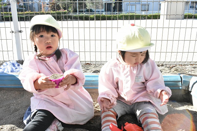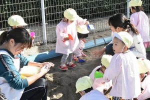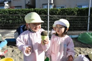 砂場で、アイスクリームやプリンなどみんなで作って楽しみました。
