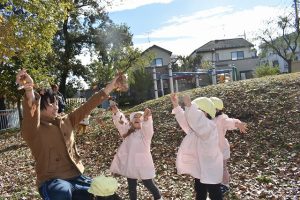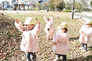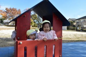 いちご組の散歩の様子です。今日はしのは公園で遊びました。 小さなお家でおままごとをしたり、落ち葉を高くあげて紙ふぶきのようにしたりして楽しく遊びました。 お天気もよく絶好のお散歩日和でした。 Post navigationPreviousPrevious post:12月4日(水)NextNext post:12月10日(火)