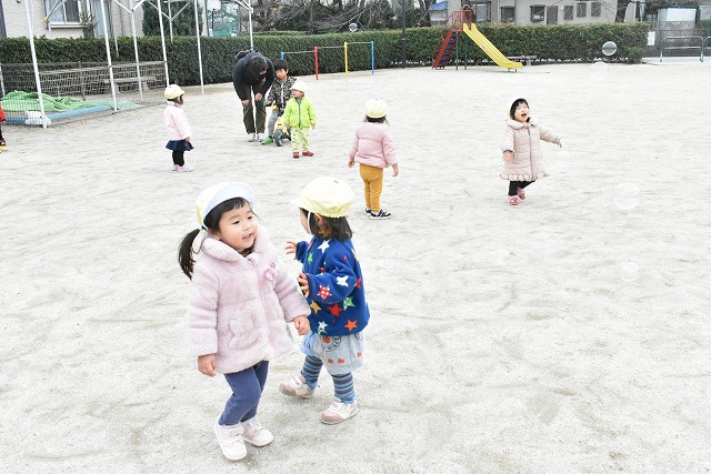 本日はいちご組の様子です。 しのは公園に遊びに行きました!! 寒さを感じさせないくらい、元気に走り回ってしゃぼん玉を追いかけまわしてました。 明日も元気に遊ぼうね☆ Post navigationPreviousPrevious post:12月26日(木)NextNext post:1月7日(火)