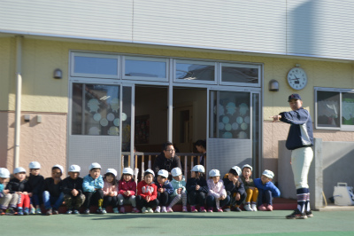 そら組とたいよう組は春日部東高校の野球部の皆さんにお越し頂き、 おもちゃのバットとボールを使った簡単なゲームをしました。 バッティングゲームでは、野球部の皆さんの「ナイスバッティング!」 という賛辞に、とても喜んでいまし…