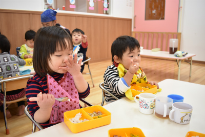 もも組の給食の様子です。 みんな美味しそうにパクパクと食べていました。 もっと欲しそうに食べ終わったお皿に手を伸ばしていました。 そら組の室内遊びの様子です。 「じゃんけん列車」をしました。沢山じゃんけんをして とても長…