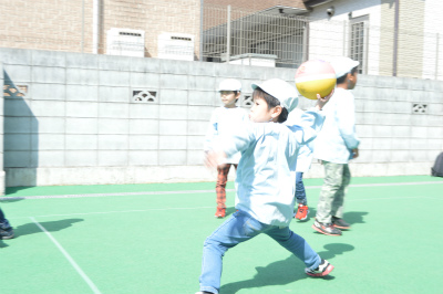 もも組はミルク缶で作った太鼓で遊びました。 最初から興味心津々ですぐにバチ代わりの スプーンを手にしてトントンと上手に演奏していました。 たいよう組の園庭遊びの様子です。 みんなでドッチボール…