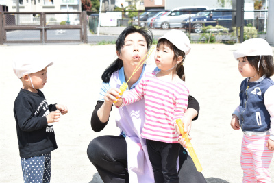 もも組といちご組の散歩の様子です。 今日は八幡コミュニティーセンターの中庭で遊びました。 シャボン玉にとても興味津々で浮かんでいるシャボン玉を 掴もうと、追いかけていました。 いちご組のお友だちはもも組のお友だちに とて…
