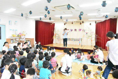 今度の日曜日は七夕ですね☆ 保育園でも七夕集会を行いました。 先生から七夕の由来を教えてもらい、「良いお耳」で聞いています。 どのクラスも、工夫した笹飾りを作りました。 たいよう組は代表のお友…