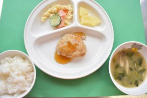 ~今日の給食~ ・豆腐ハンバーグ ・マカロニサラダ ・ごはん ・ほうれん草としめじのみそ汁 ・パイン ~今日のおやつ~ ・牛乳 ・ポテトフライ Post navigationPreviousPrevious post:ポラス絵画展NextNext post:11月4日(水)