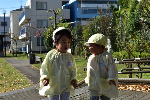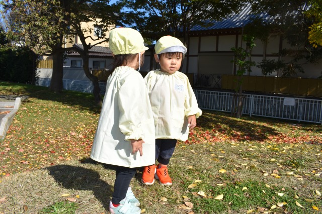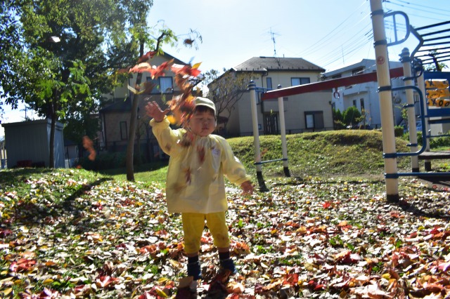 今日はしのは公園に落ち葉がたくさん落ちていたので触ったり投げたりして遊びました。