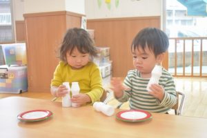 いちご組の様子です。 みんなでどんぐりを入れてマラカスを作りました☆ たくさんふって、カラカラと鳴る音を楽しんでいました♪ Post navigationPreviousPrevious post:11月20日(金)NextNext post:11月24日(火)