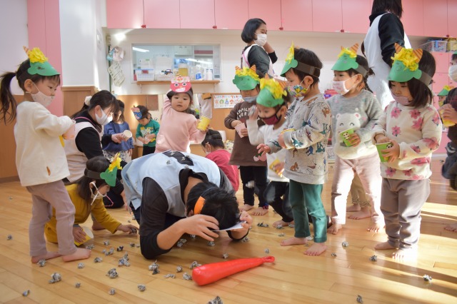 保育部さんは先生が鬼役をして新聞紙で作ったお豆で豆まきをしました。