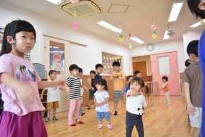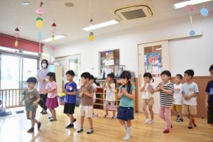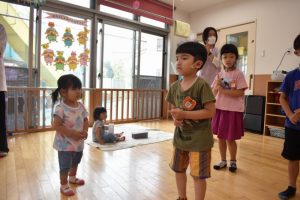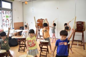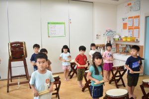 たいよう組の様子です☆ いちご組と一緒に夏祭りの練習を行いました♪ 素敵な見本となってとてもかっこよかったです。 太鼓の練習の様子です☆ 皆で声出して、息を合わせながら頑張っています☆ Post navigationPreviousPrevious post:7月5日(月)NextNext post:7月6日(火)