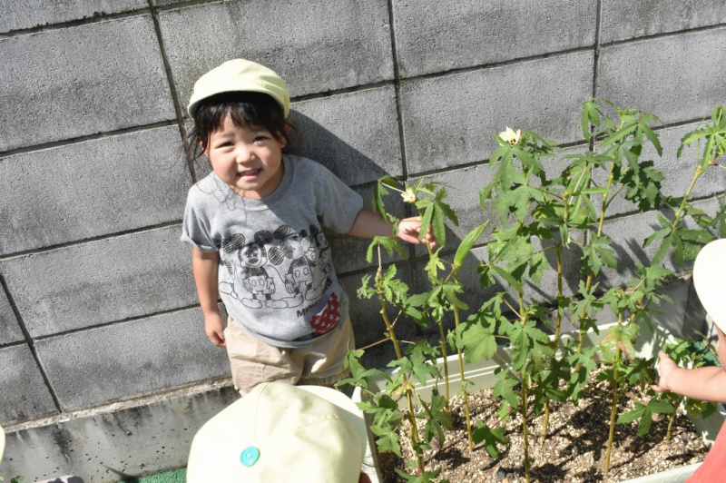もも組の散歩の様子です。 ふれあい公園までカートで行きました! 公園では遊具で楽しく遊びました。 めろん組の園庭遊びの様子です。 園庭で育てているオクラを観察しました。 みんなワクワクした表情でオクラをじっと見ていました。 Post navigationPreviousPrevious post:9月21日(火)NextNext post:9月28日(火)