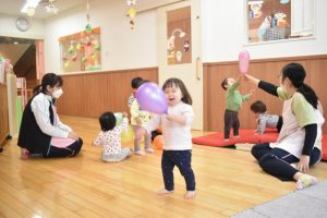 本日はもも組の様子です☆ 風船をもって投げたり転がしたりしながらニコニコしながら遊びました!! マットを使ってゴロゴロしたり、マットをトンネルしていないないばあを楽しんでいるお友達もいました。 もも組さんはきちんとお座りをして水分をとることができます♪ 大きくなったね☆ Post navigationPreviousPrevious post:10月15日(金)NextNext post:10月26日(火)