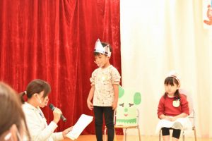 一人一人好きな食べ物や好きな遊びをインタビューされ、上手に答えていました。